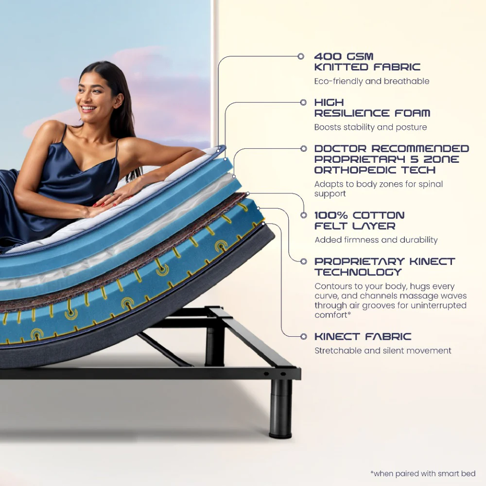 Wave Plus Adjustable Bed Tranquil Upholstered Bed (Beige)+ Wave Kinect Strength Mattress 8"(20.3cm)